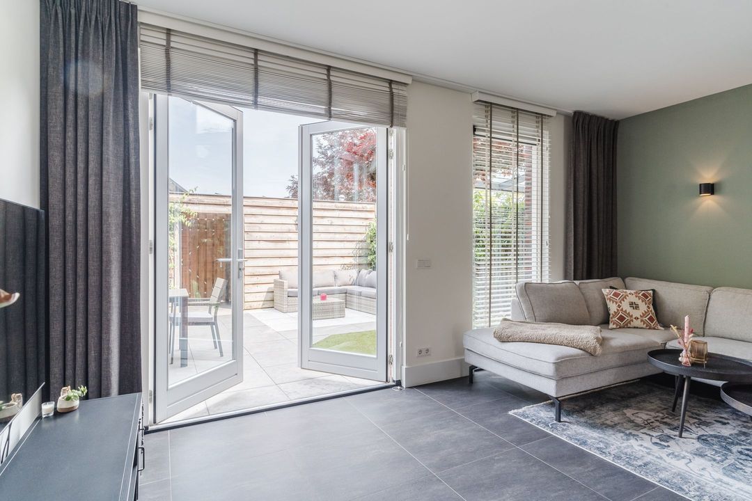 De woonkamer van ca. 25m² is geheel voorzien van een hoogwaardige tegelvloer welke voorzien is van vloerverwarming. Onder de trap zit een praktische provisiekast en de woonkamer heeft direct tuincontact dankzij de grote raampartij en openslaande deuren.